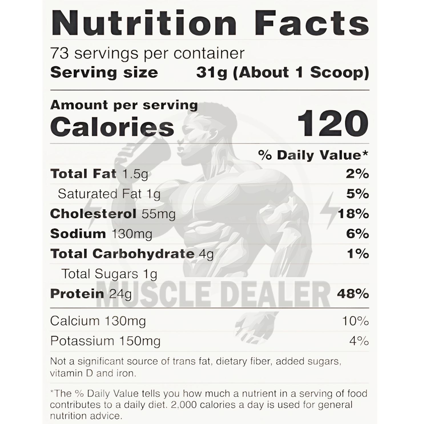 جولد ستاندرد واي بروتين من أوبتيموم نيوترشن يقدم 24 غرامًا من البروتين النقي في كل حصة، مع تركيز عالٍ يصل إلى 79%. يحتوي أيضًا على أكثر من 4 غرامات من الجلوتامين وحمض الجلوتاميك، و5 غرامات من الأحماض الأمينية المتشعبة (BCAA) لدعم التعافي والنمو العضلي.